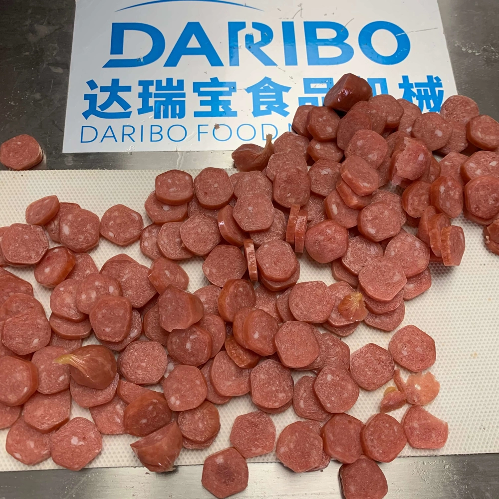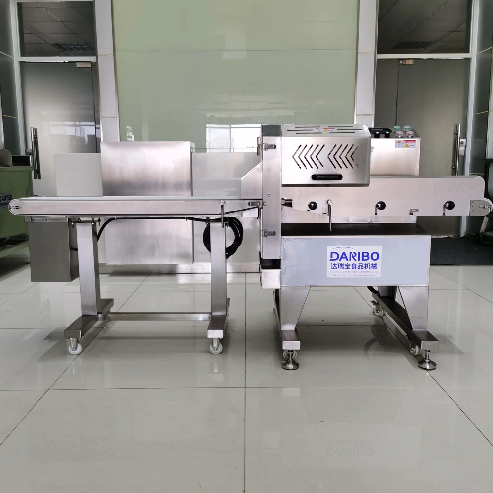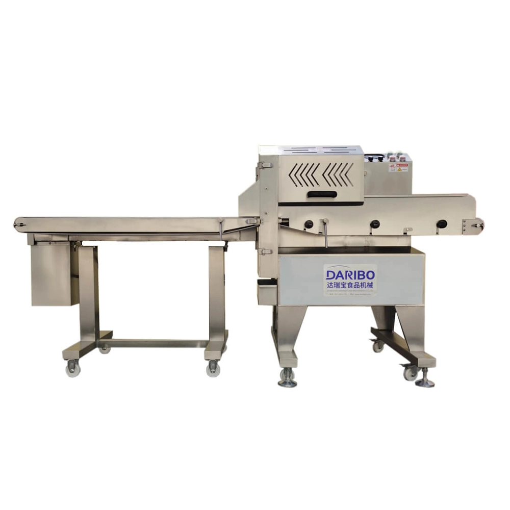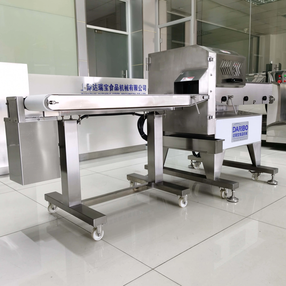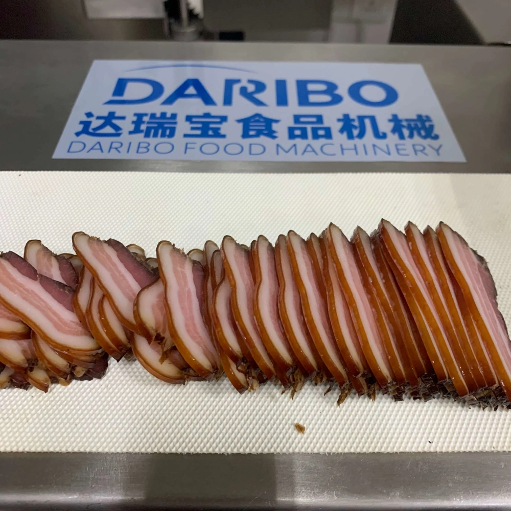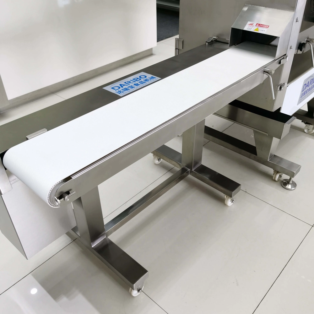 达瑞宝输送式切熟肉机,出料口带输送带。此机是本公司自行研发、设计的一款加宽型切熟肉机器,采用特制进口刀片能将叉烧肉、卤味、猪头皮、猪耳朵、牛肚、肥肠、牛肉、带骨鸡鸭鹅等熟肉卤肉烟熏肉制品以及长条类瓜果蔬菜切割成条、片状,出料口连接输送带,使得切出来的物料摆放整齐,无需排列可直接装入托盘。适用快餐业,超市,大型食堂,食品行业加工厂。