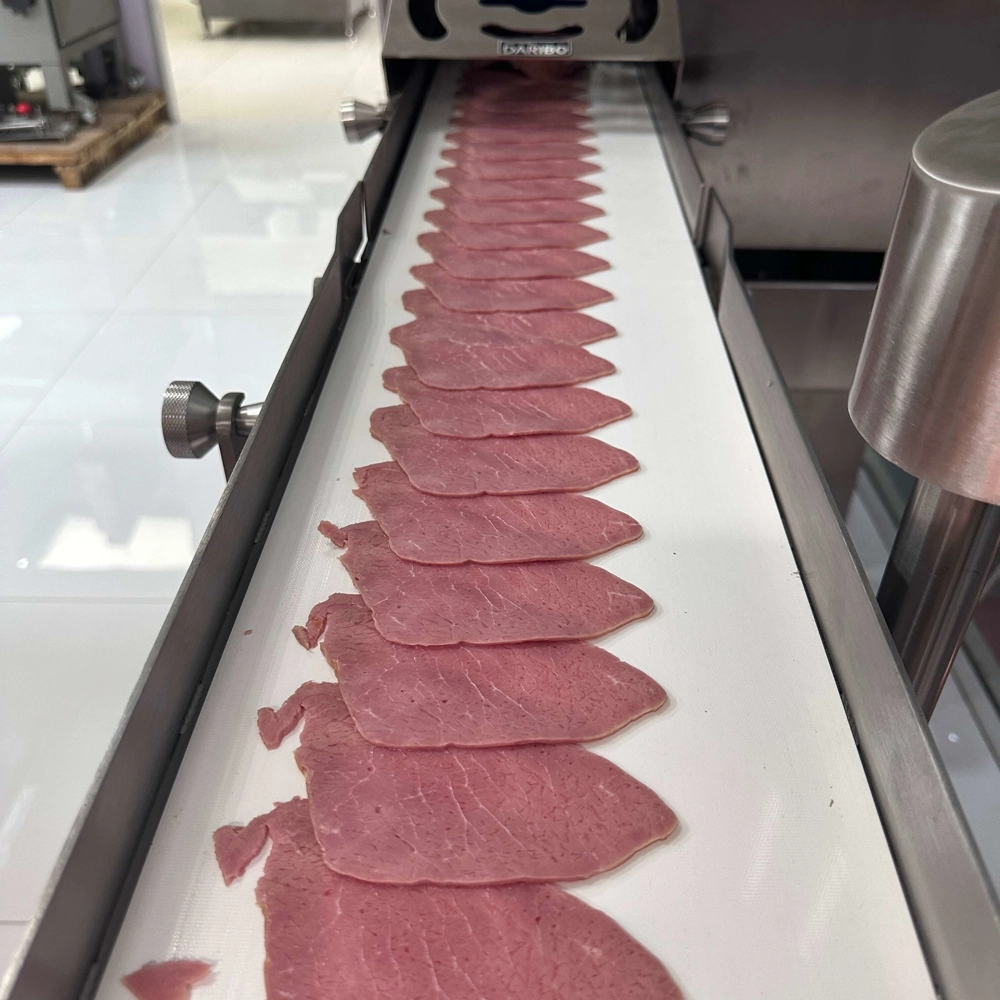 达瑞宝冷鲜肉切片机采用国际先进的剪刀式切断方式,选配锋利的德国刀具,可切出完美的薄片效果,具有分份和叠放功能,可切鲜肉,熟肉,水产等。